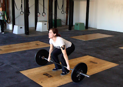 I was supposed to do the snatches at 115# - however, due to the shoulder/rotator cuff problems I've been having I decided to do 75# snatches and 2 overhead squats for each snatch. So, actually, I did 7 snatches, 14 OHS, 10 GHD Situps, 15 DUs each round ....